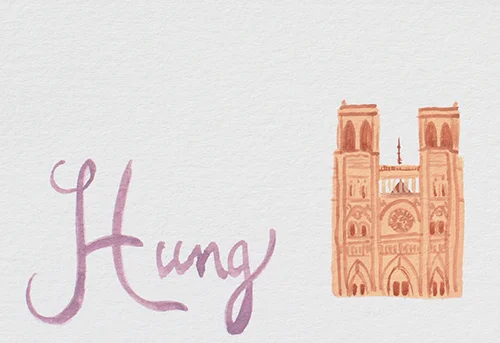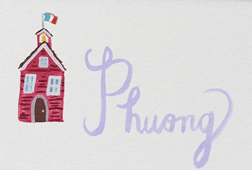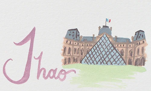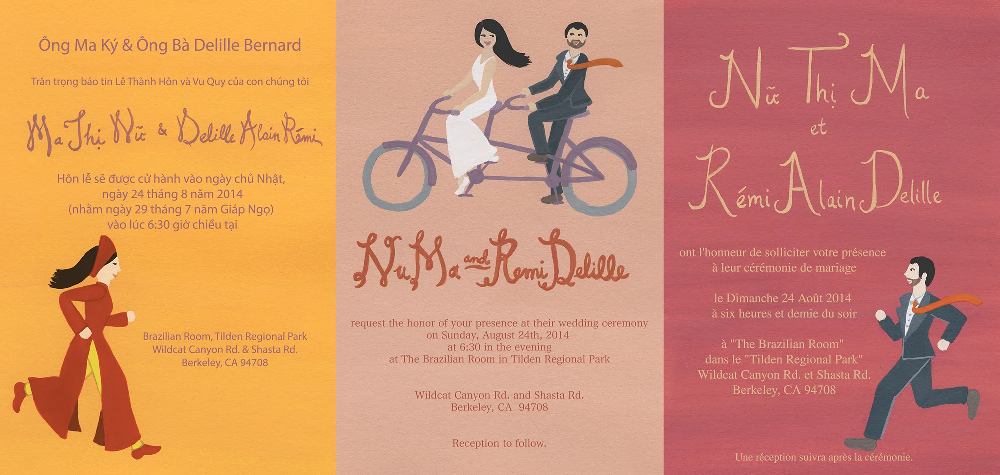 the invitation, like the save the date, was sent to multiple countries to people who speak multiple languages, so we decided to do a trifold triptych with a panel in each vietnamese, english, and french. at the ceremony, nu wore a lovely traditional vietnamese ao dai. she changed into a beautiful white gown from bhldn for the reception. i didn't really paint her exact dresses for the invite (now wishing i had!! grr!!), but i love the way the card came out.