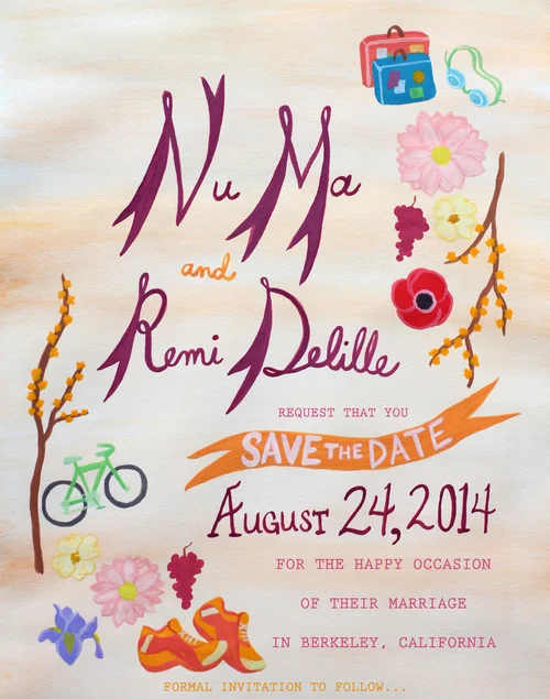 a pair of ultra-marathon-running, travel- and food-loving, optoelectronic engineer friends of mine asked me to design their wedding invitations and save the dates. i couldn't have been happier to take on this project! for the save the date, i incorporated flowers from their old and new home states (they recently moved from north carolina to california), and their families' home countries (france and vietnam).